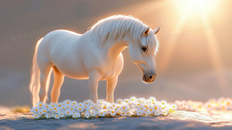 > 阳光下的白色骏马与花卉背景