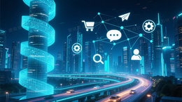 > [30岁亚裔男性][银边智能眼镜][未来感机能外套][全息数据流背景][冷调霓虹照明][数字粒子特效][棱角分明的面部轮廓][自信微表情][机械臂手势][赛博都市倒影]