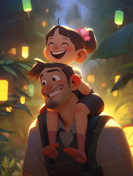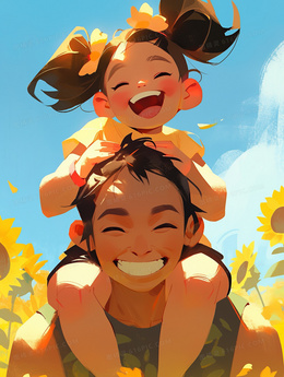 父亲节爸爸肩上扛着女儿开心的笑着插画