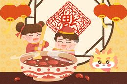 彩色手绘卡通小朋友龙年吃腊八粥插画