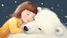 > 抱着北极熊睡觉的小姑娘插画