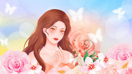 > 唯美水彩花朵蝴蝶长发女性插画图