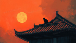 落日晚霞猫爬屋檐背景