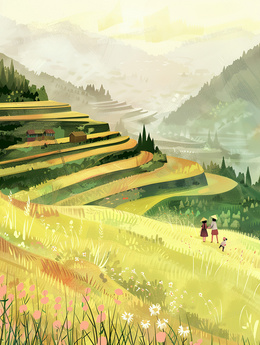 山地梯田上的人们插画
