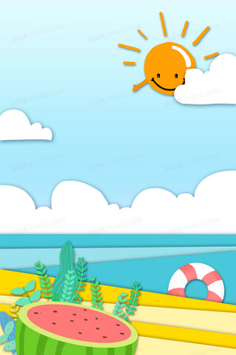 > 凉爽夏日大海蓝天剪纸风格插画背景