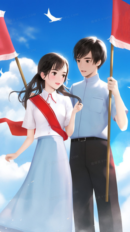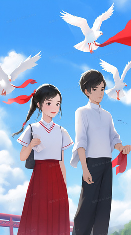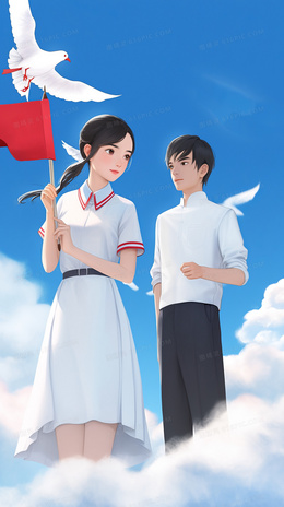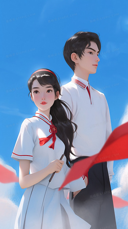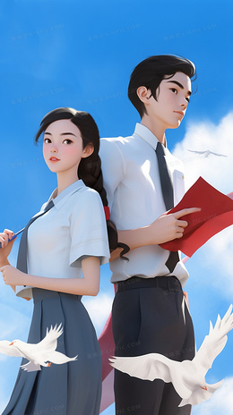 毕业季穿着校服的学生站在蓝天白云下憧憬未来