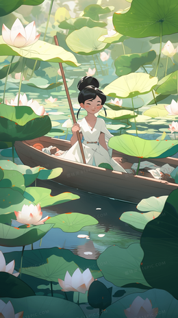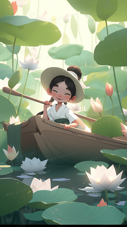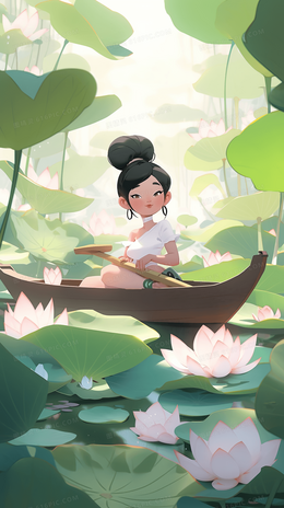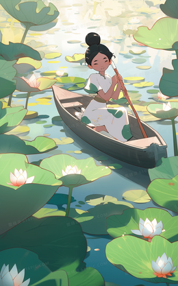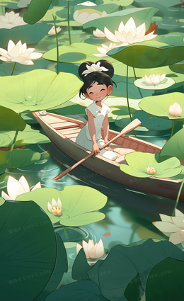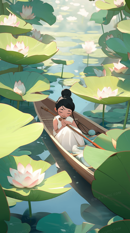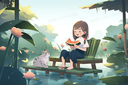 > 卡通风夏日荷塘里可爱女孩在吃西瓜插图
