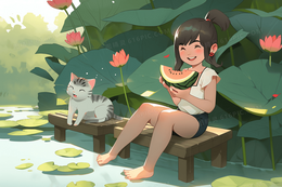 卡通风夏日荷塘丸子头小女孩笑着坐在池塘边和猫猫吃西瓜插图
