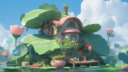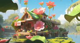 > 夏天荷塘3D模型河景房插画
