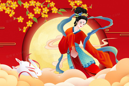 红色嫦娥玉兔中秋国庆双节同庆插画