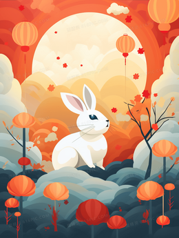 中国风中秋节花朵中的小白兔可爱插画
