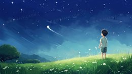 蓝色唯美梦幻星空月亮草地手绘插画背景