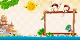 卡通手绘幼儿园照片墙太阳绿树城堡海报背景