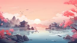 粉色中国风唯美建筑山水风景插画