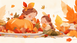 两个孩子吃感恩节大餐手绘插画