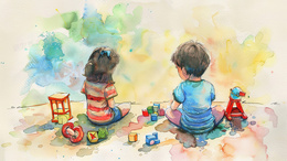 > 卡通水彩风两个孩子玩耍背影背景