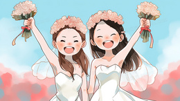 韩式唯美新郎和拿着捧花的新娘在微笑婚纱照3D模型插画