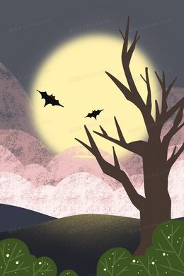 > 红色夜晚月亮树木诡异风景卡通手绘万圣节插画背景