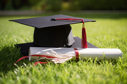 草坪上有一个博士帽和通知书