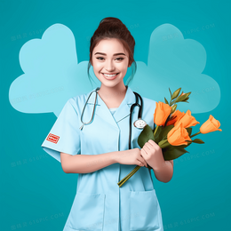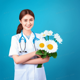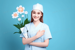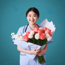 长相甜美的护士穿着工作服手捧鲜花开心的笑