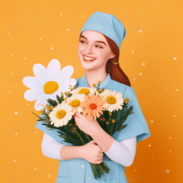 > 国外身穿白色护士服的护士手捧鲜花开心的笑