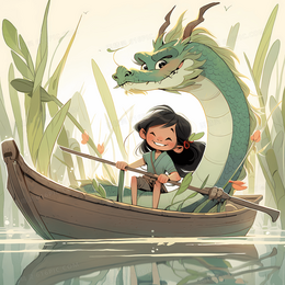 端午节可爱的小女孩和一条巨龙开心的划船游湖