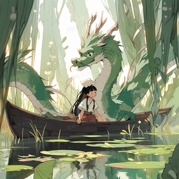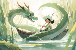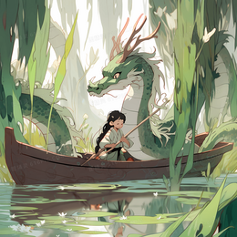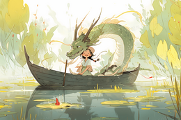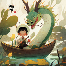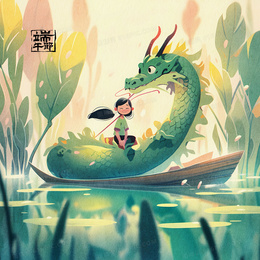 可爱的小女孩和一条巨龙开心的划船游湖端午节插画