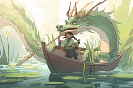 端午节可爱的女孩和一条巨龙开心的划船游湖创意插画