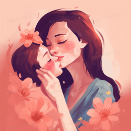 > 妈妈在花丛中亲吻孩子