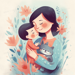 妈妈在花丛中怀抱女孩水彩插画
