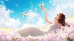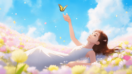 唯美少女躺在花丛中触摸蝴蝶创意插画