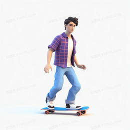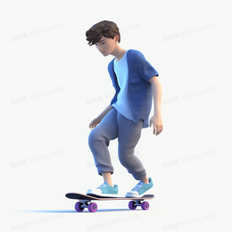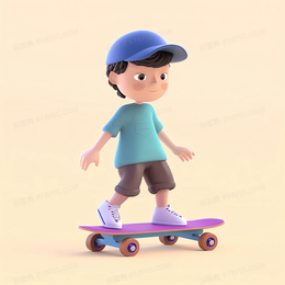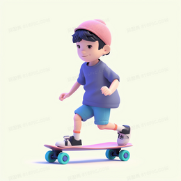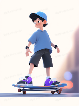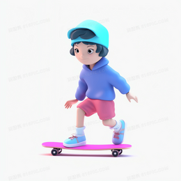戴着蓝色帽子玩滑板的可爱男孩3D模型