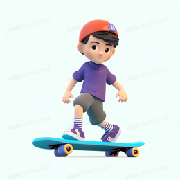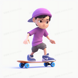 反戴紫色棒球帽玩滑板的可爱男孩3D模型
