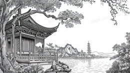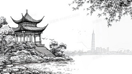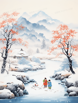 冬天在小河冰面上行走的老人小孩中国风建筑风景插画