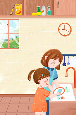 家务洗碗帮助父母插画风背景