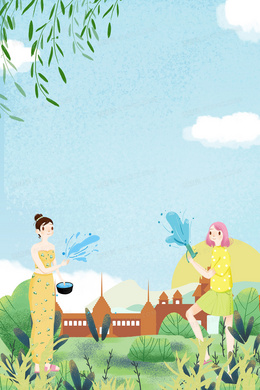 可爱的手绘插画风格少数民族少女泼水节傣族背景