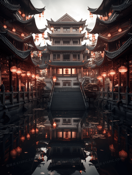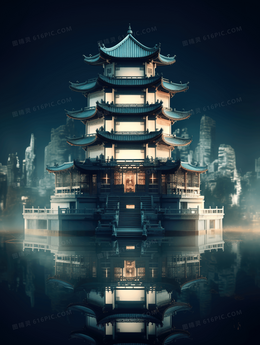 湖中央的中国风古建筑风景摄影