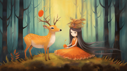 女孩和驯鹿唯美清新麋鹿森林女孩插画