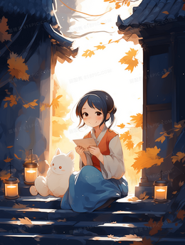 冬天坐在落满金色树叶石阶上女孩和猫咪插画
