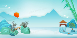 > 夏季中国风清新山水亭子剪纸风景物背景