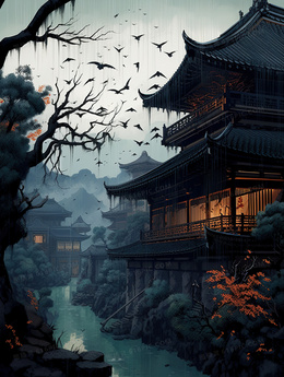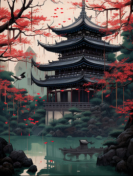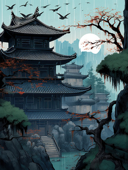 中国风古风山水建筑插画
