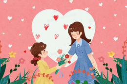 母亲节孩子送花妈妈温馨插画