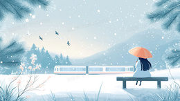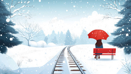 > 冬季铁轨边上风景观雪女孩背影卡通背景