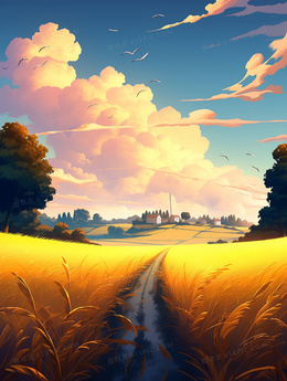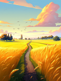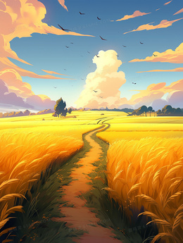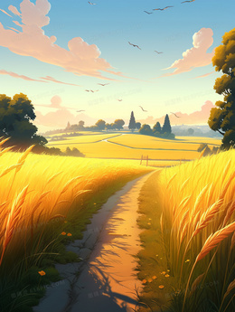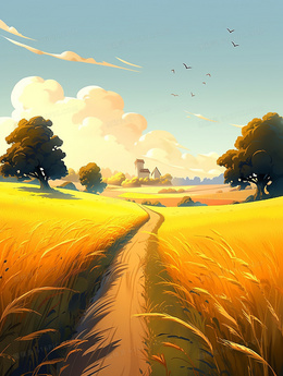 卡通唯美金色的麦田小路