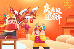 庆元旦迎新年两个小孩踩板凳放鞭炮插画