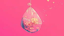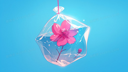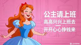 粉红色纯色背景左边有一个穿着蓝色裙子带着红色蝴蝶节的公主