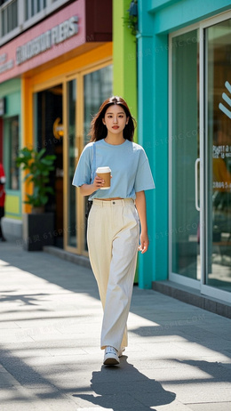 阳光明媚的都市街道年轻女性穿着宽松纯色T恤和高腰休闲裤