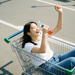 坐在购物车里开心大笑的女孩纯色干净明亮背景