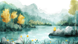 > 春分唯美水彩风森林小河插画