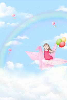 > 蓝天白云千纸鹤女孩卡通插画背景